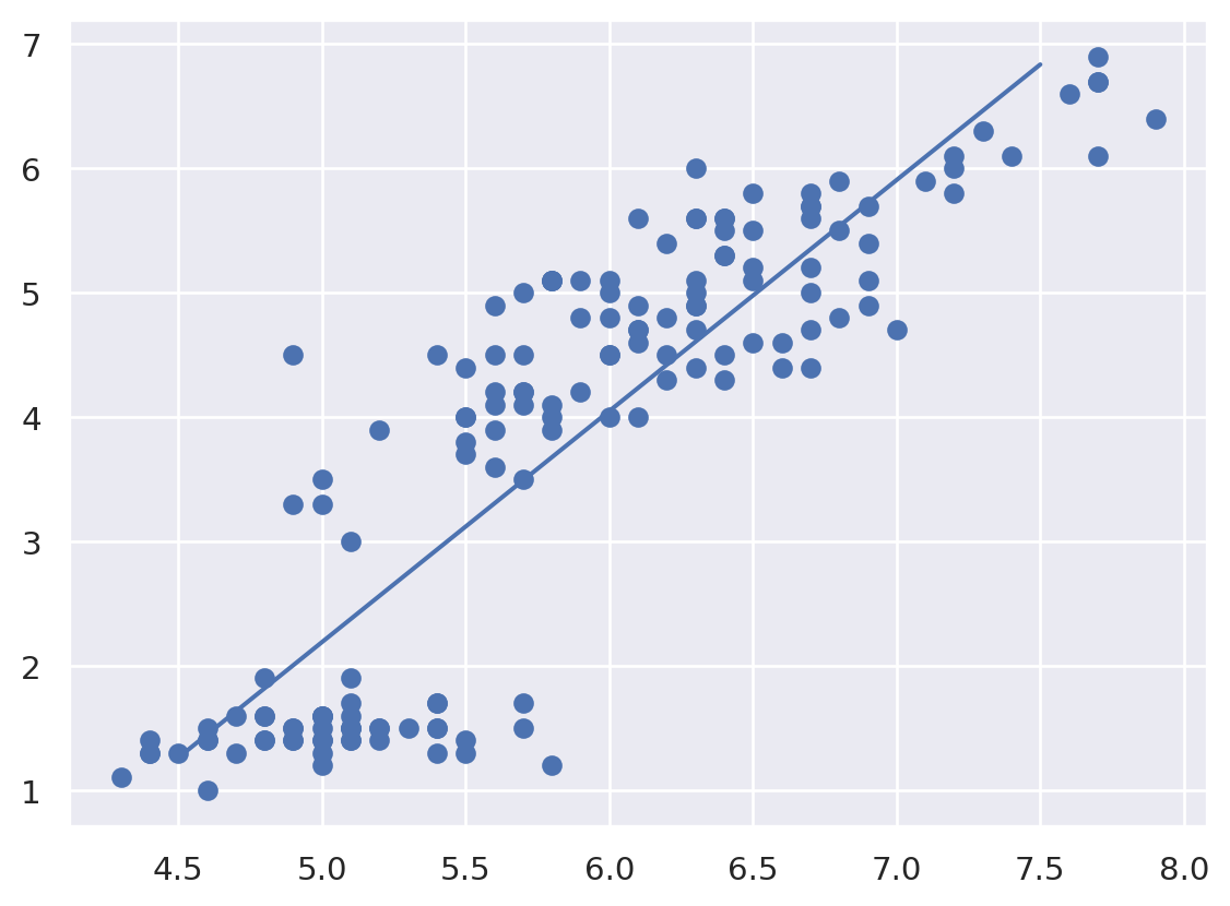 print("Formula: petal_length = {} * sepal_length + {}".format(np.round(model.coef_[0],2), np.round(model.intercept_, 2)))Coef: [1.85843298]
