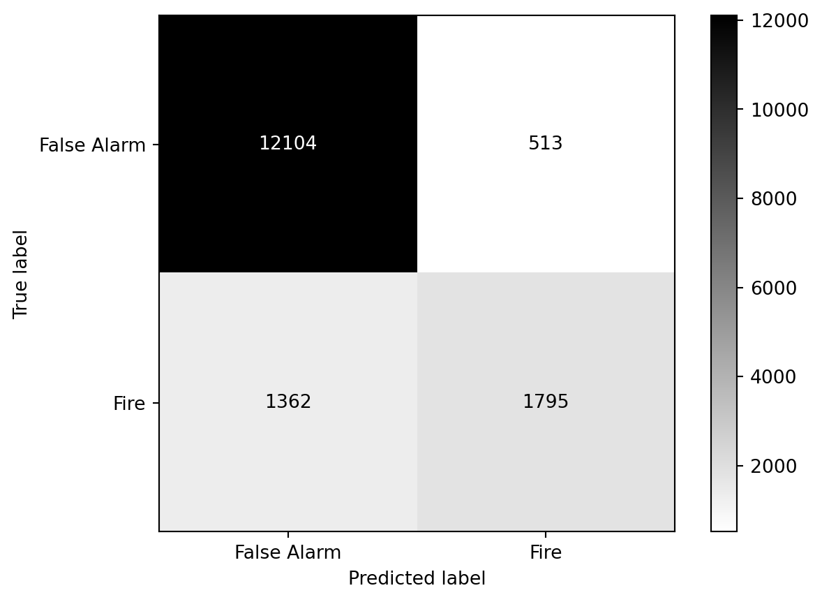 # print the confusion matrix using ConfusionMatrixDisplayfrom sklearn.metrics import ConfusionMatrixDisplayConfusionMatrixDisplay(confusion_matrix=conf_matrix, display_labels=['False Alarm', 'Fire']).plot(cmap='gray_r')