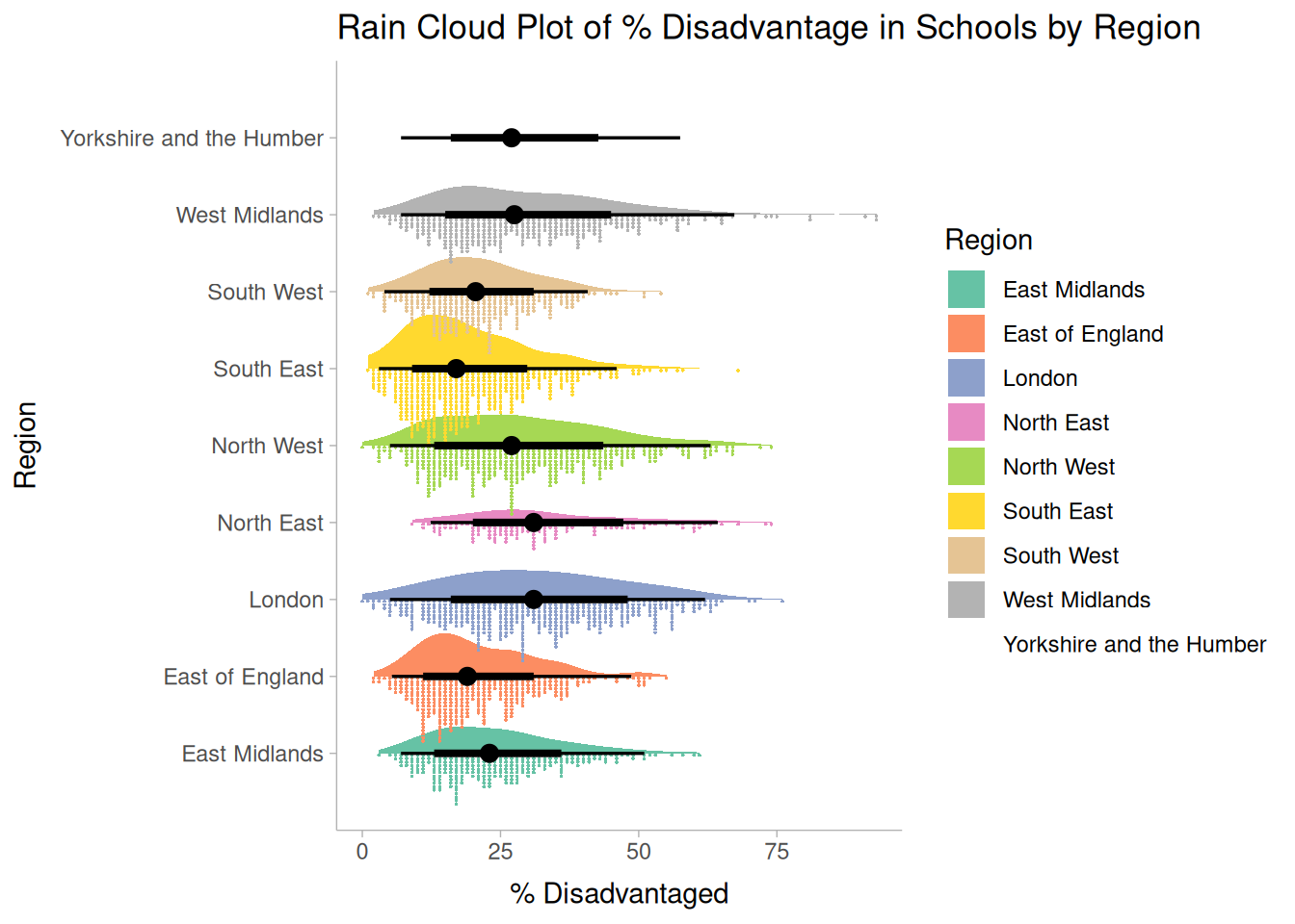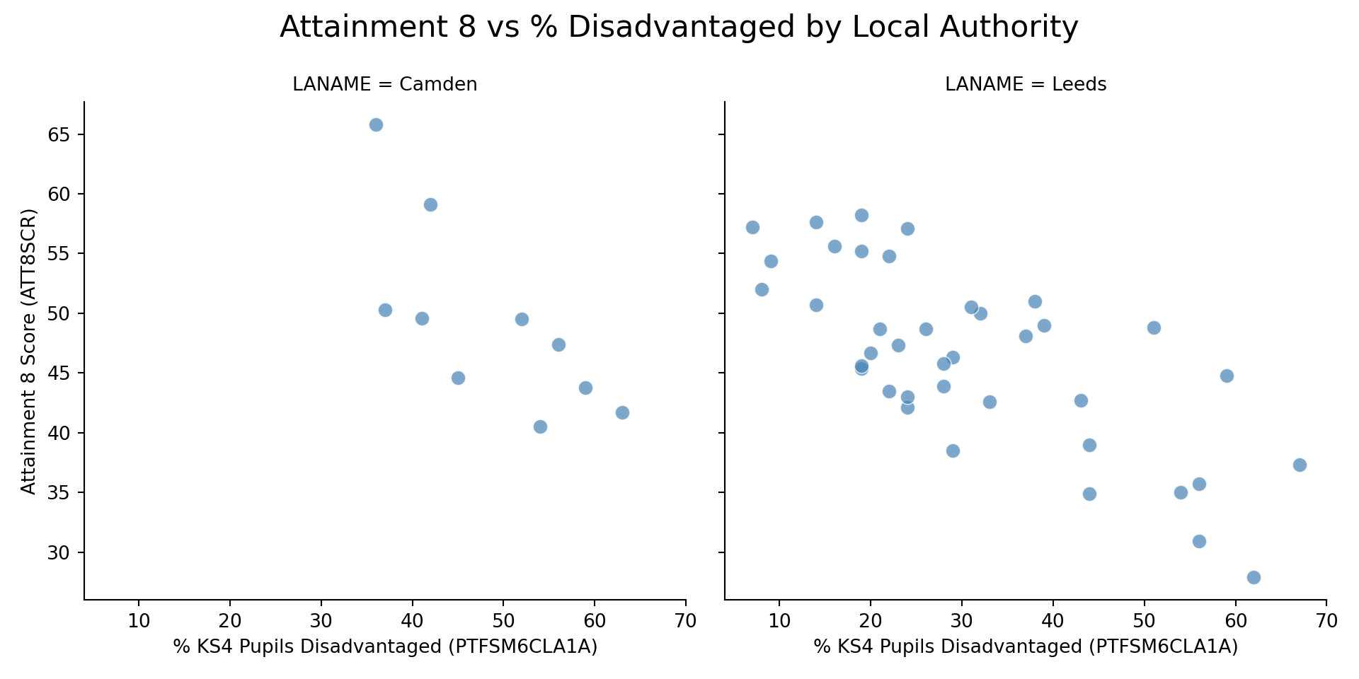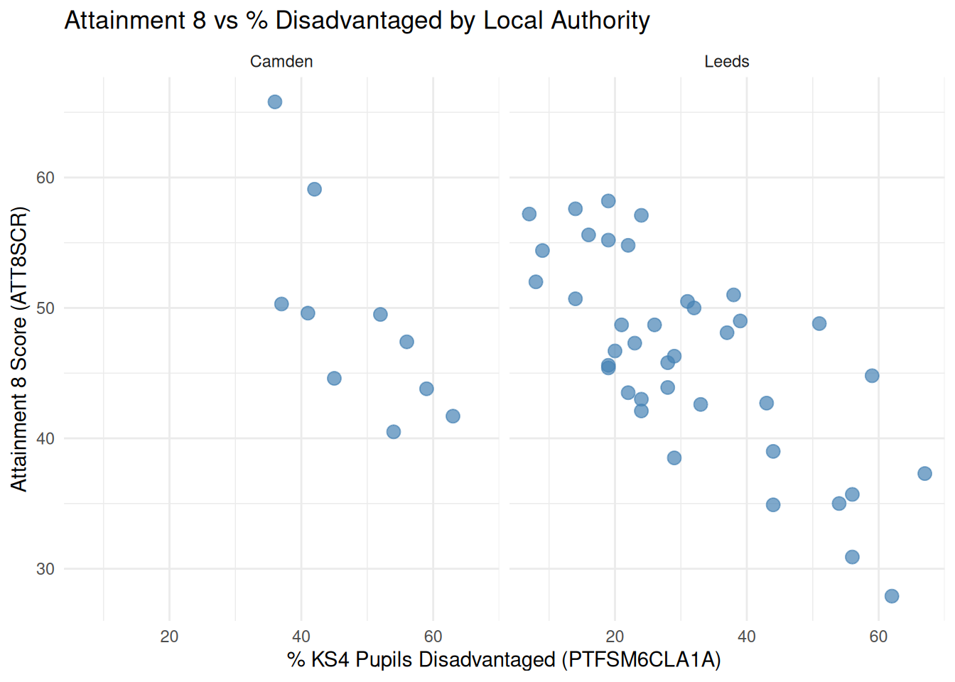 This effect is similar for Leeds, but apparently far more severe in Camden where the slope is much steeper. However, Camden doesn't experience very low levels of disadvantage in its schools (unlike in Leeds and the rest of the county), with the lowest level around 35%. With low numbers of schools in the Borough, this observation is potentially unreliable.