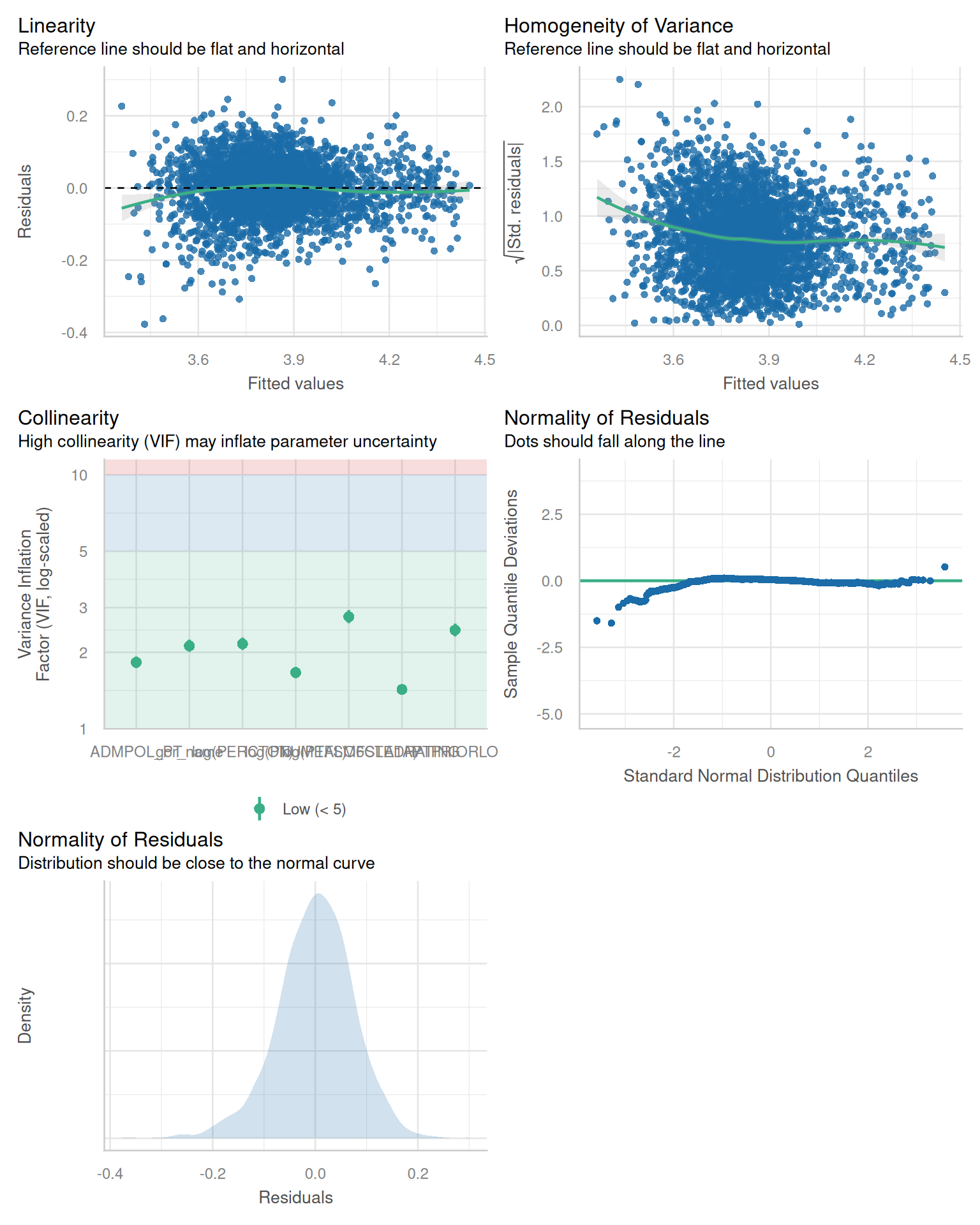 england_model5 <- lm(log(ATT8SCR) ~ log(PTFSM6CLA1A) + log(PERCTOT) + log(PNUMEAL) + gor_name, data = england_filtered_clean, na.action = na.exclude)