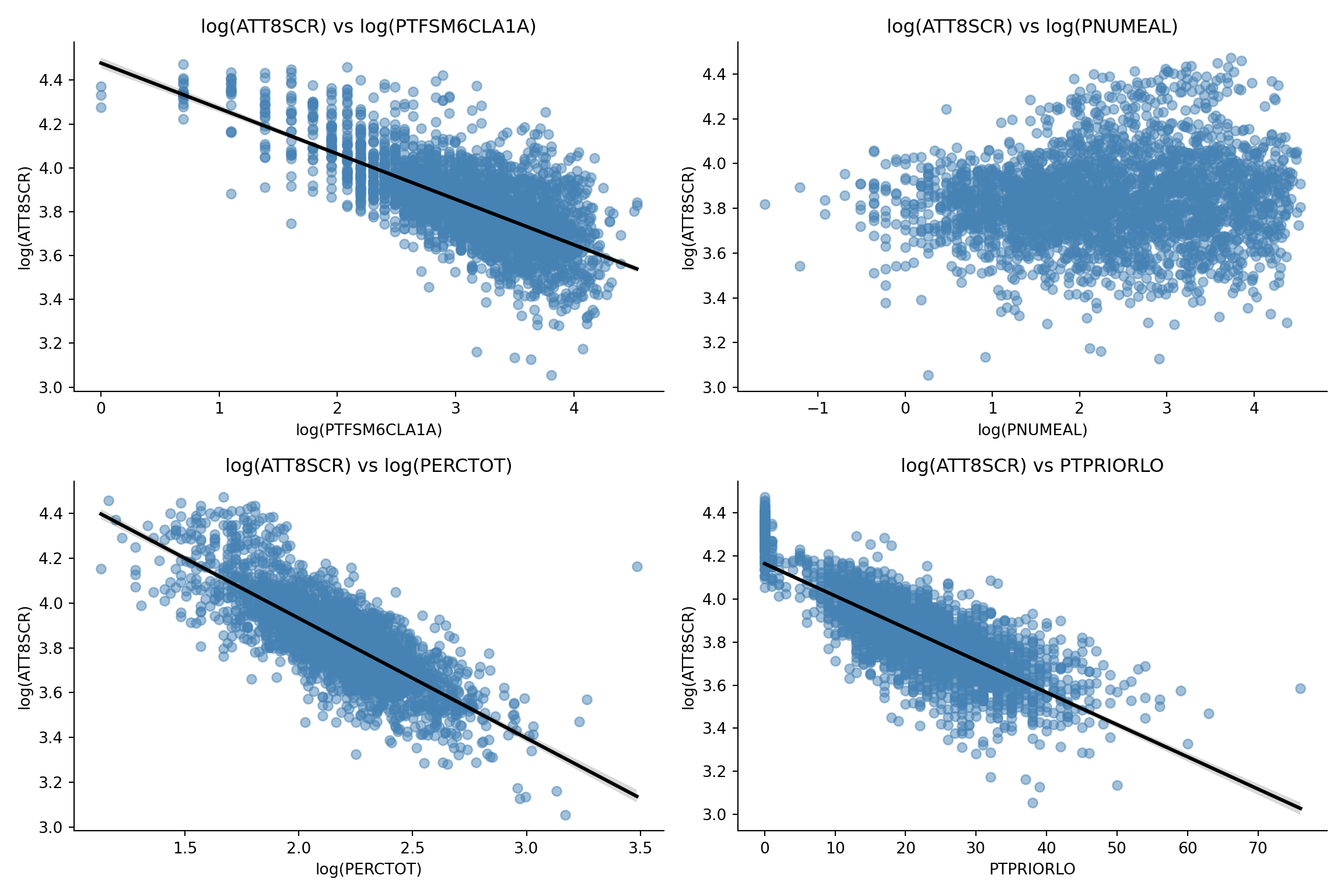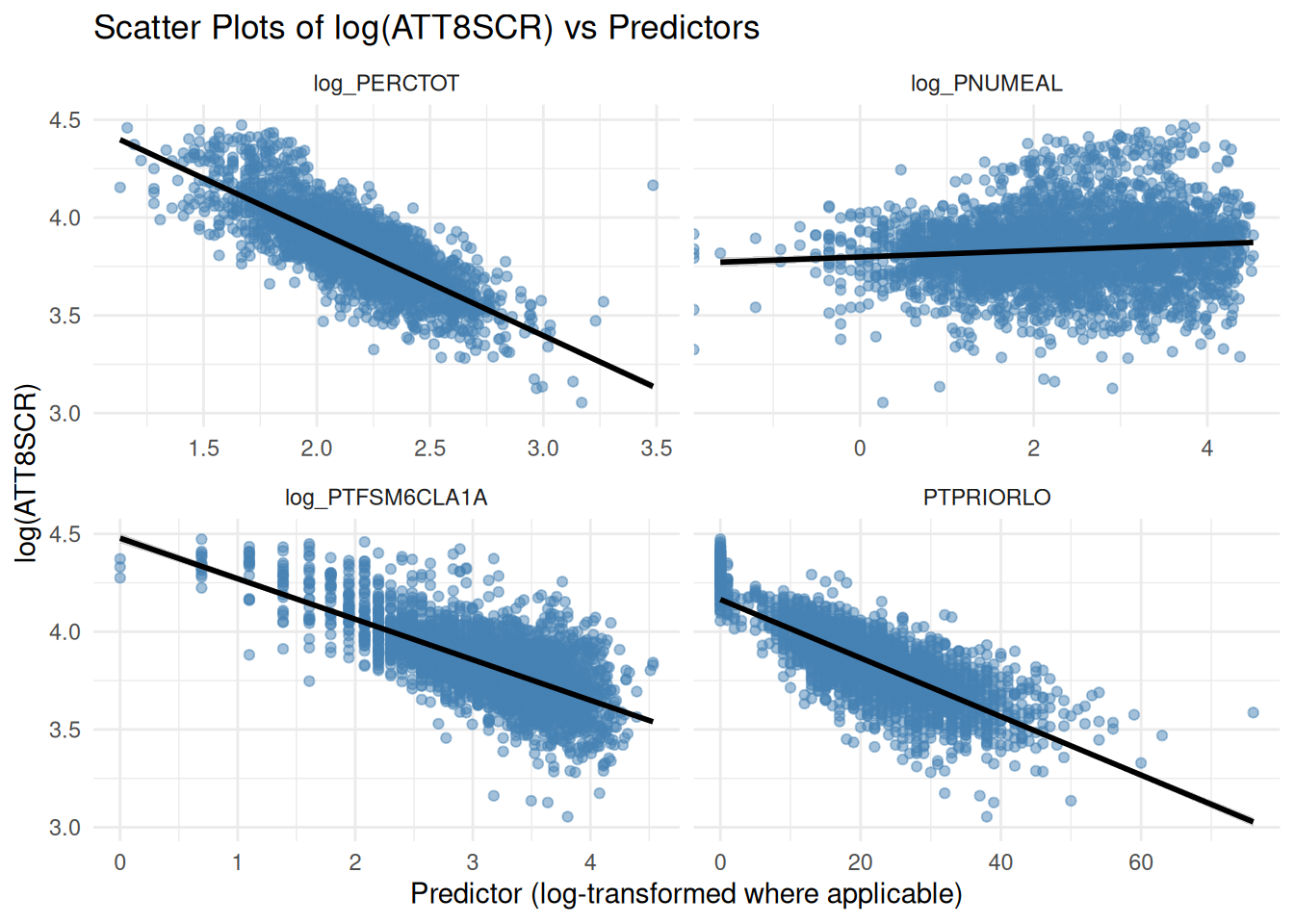 england_model4 <- lm(log(ATT8SCR) ~ log(PTFSM6CLA1A) + log(PERCTOT) + gor_name, data = england_filtered_clean, na.action = na.exclude)